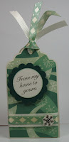 The challenge for day 227 at 365 Cards is a card recipe. The recipe is: 1 tag (as the card base) 2 pieces of ribbon green 1 piece of patterned paper 2 stamps And that is all you can use on your card.